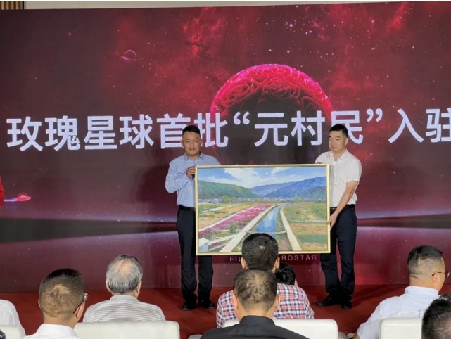 余杭区五常街道文一社区居民成为首批入驻玫瑰星球的“元村民”。清凉峰镇新峰村党总支书记邵剑向杭州市五常街道文一社区党委书记杨秋余赠送《玫瑰小镇》油画。