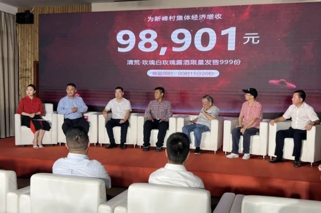 文一社区党委书记杨秋余、南昌商会会长张建平现场表态支持结对乡村——新峰村,购买玫瑰白酒。999瓶玫瑰白酒一经发布,1分钟20秒售罄,为新峰村村集体创造了98901元销售。此次限量发售的玫瑰白酒,不仅可以成为玫瑰星球元村民,还可以获得油画数字藏品《玫瑰小镇》,这是全国首批由村集体发布的数字藏品。